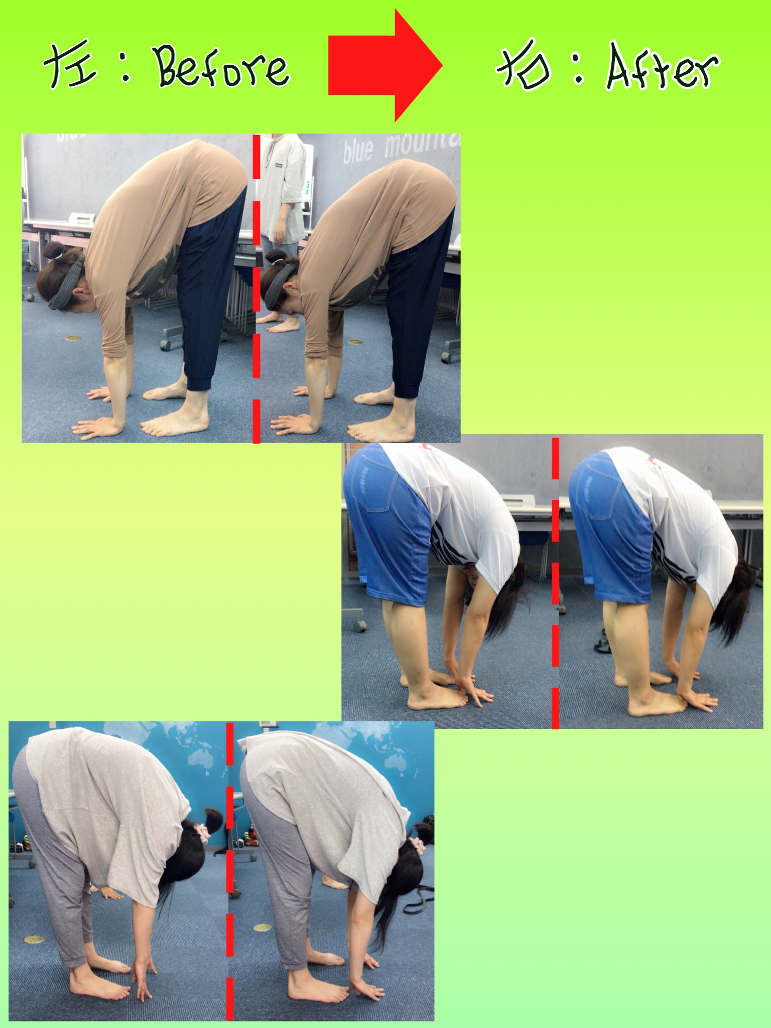 「秘密兵器。笑」も使いながらの"ストレッチ"や"ネコエクササイズ"を経て、1時間経ったところで、Before⇔Afterを確認すると、、、