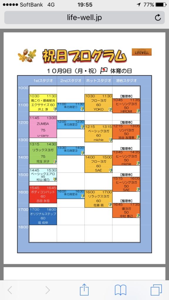 本日祝日のスケジュールはこちら! 2017.10.09 本日祝日のスケジュールを発表いたします! よろしくお願いします(^^) 10/9(祝・月) ○逗子スポーツクラブ 10:30〜11:30 エアロビクス初中級 ○アスリエ鷺沼 14:00〜15:00 ファイドウ 15:15〜16:00 リトモス45 ○ライフウェル溝の口 17:00〜18:00 オリジナルステップ ご参加予定の皆様、よろしくお願いします! フィットネス ハロウィンですね 10/19(木) KFC 関連記事一覧 フィットネス 仲間になりませんか? 2017.12.24 フィットネス 北海道ニ日間お邪魔します! 2017.08.04 フィットネス G.W.のスケジュールアップします! 2018.04.20 フィットネス 無事にダンスエアロ終了です(^ ^) 2017.09.18
