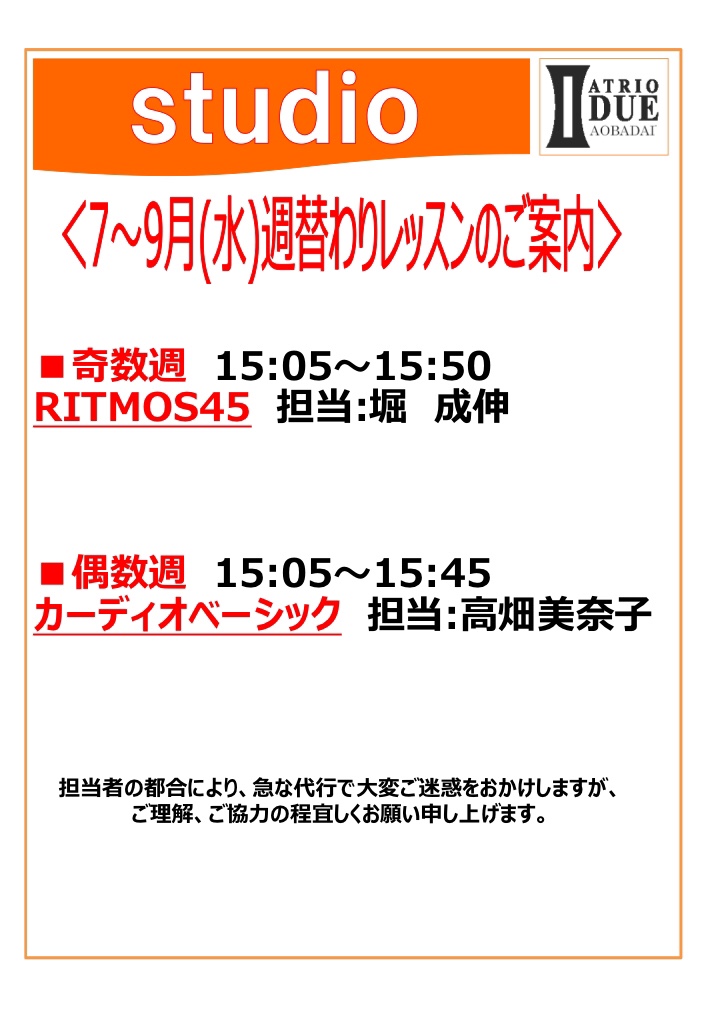 7月から9月末までの水曜日奇数週で、アトリオドゥーエアトリオドゥーエ青葉台様でリトモスの レッスンを週替わりで担当させていただくことになりました。どうぞよろしくお願いいたします。