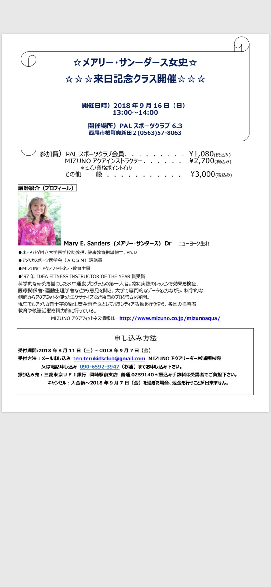 9月16.17日は、MIZUNOアクア創始者メアリー サンダース先生がなんと西尾、浜松に来てくれます〜