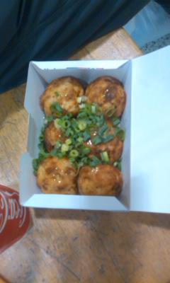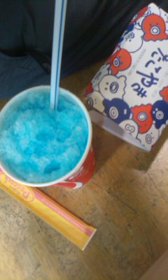 一緒にたこ焼き ( ネギ塩 ) と、かき氷 ( ブルーハワイ ) を食べ、