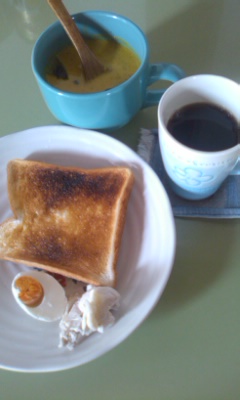 今朝は、シェフ特製カボチャのスープに、塩ゆで卵 ( 生卵を1ヶ月塩水に浸けておいたらしい ) に、ふくちゃん ( CDケース入れのアヒル部長 ) のお母さんに教えていただいた 『 鶏ハム 』 にトースト ♪♪ (^3^)
