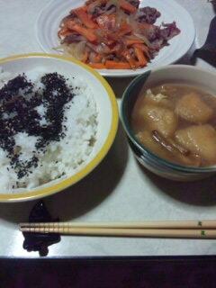 肉野菜炒めに、油揚げとナメコのお味噌汁〜 (^_^)
