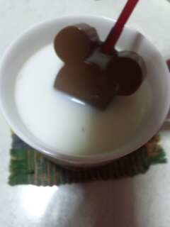 お土産をホットミルクで溶かして飲んでいます (^3^)