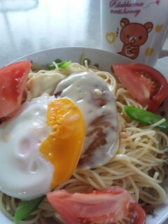 チーズハンバーグ目玉焼きパスタ♪