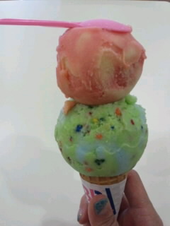店員さんが 「 カップか、ワッフルコーンにしますか?」 と聞いてくれたのに…、30円をケチって、シングルコーンにしたら…、やっちまいましたヨ…(ToT)   食べてる途中でグラリ…!慌てて手でキャーッチ!…、手、ベッタベタ… (- -;)