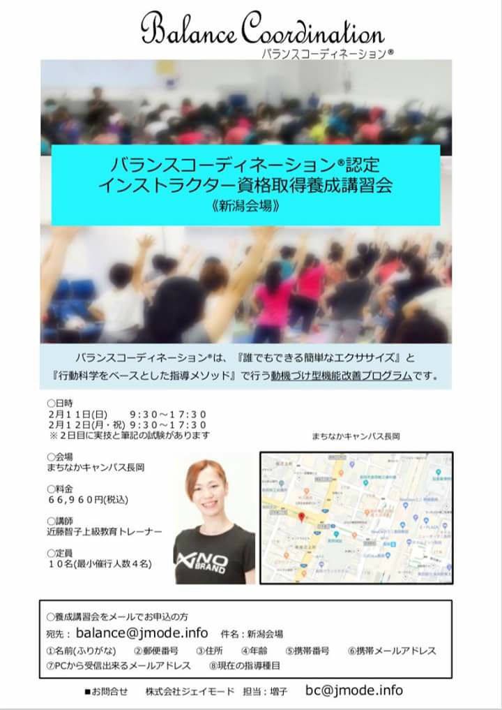 2月に長岡市まちなかキャンパスさんにて、バランスコーディネーションインストラクター養成講習会を開催いたします(^^)