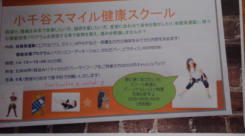 そして、バランスコーディネーションやからだバー、ピラティス、HOOPBOON(フラフープ)などで身体を整え、有酸素運動で気持ち良く汗を流す、少人数制でジックリ向き合っていただくスクールを今月末からスタートします。