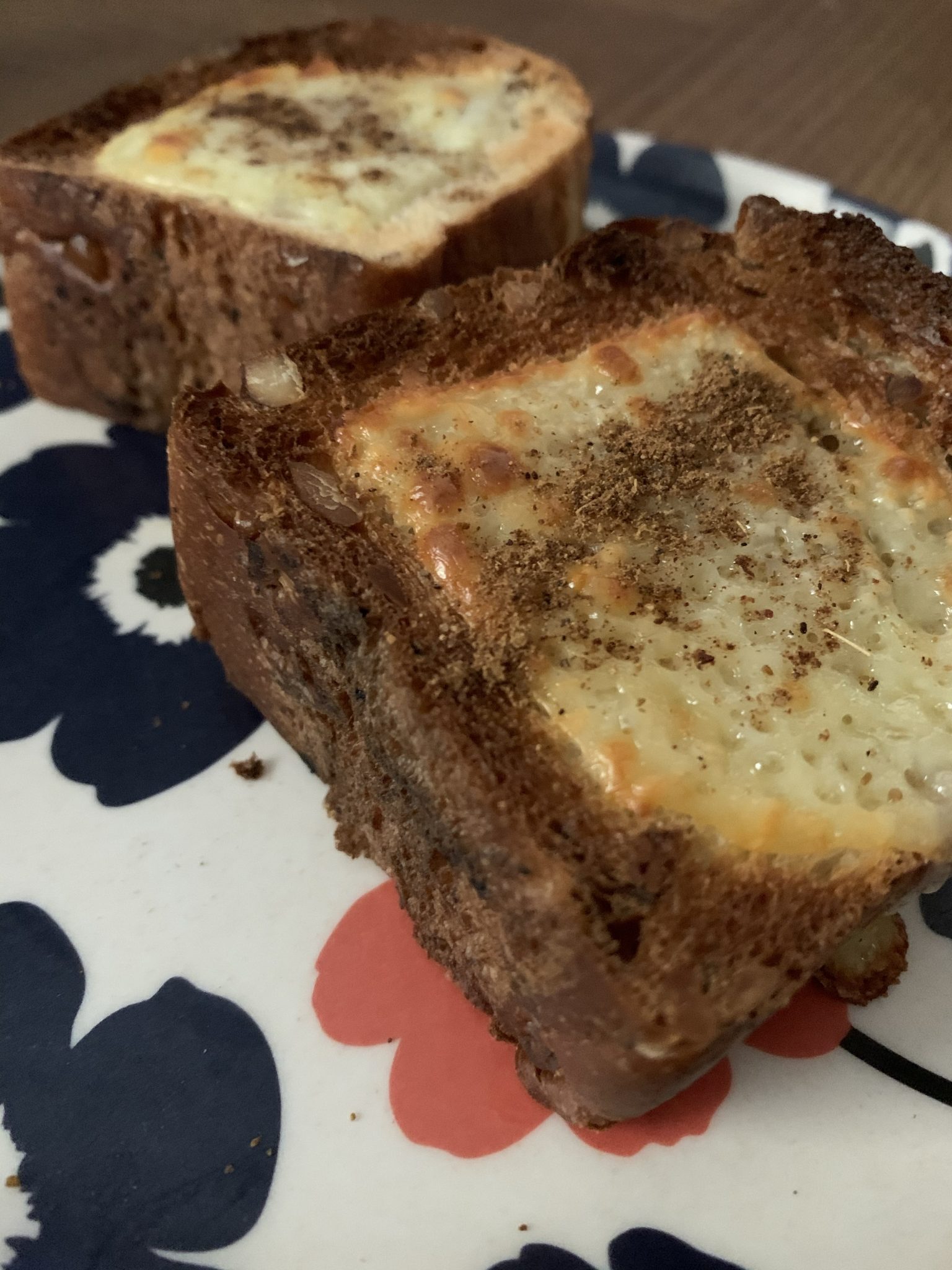 大好きなくるみパンにチーズをのせて、ガラムマサラをちょっとかける♪これが美味しいの♡