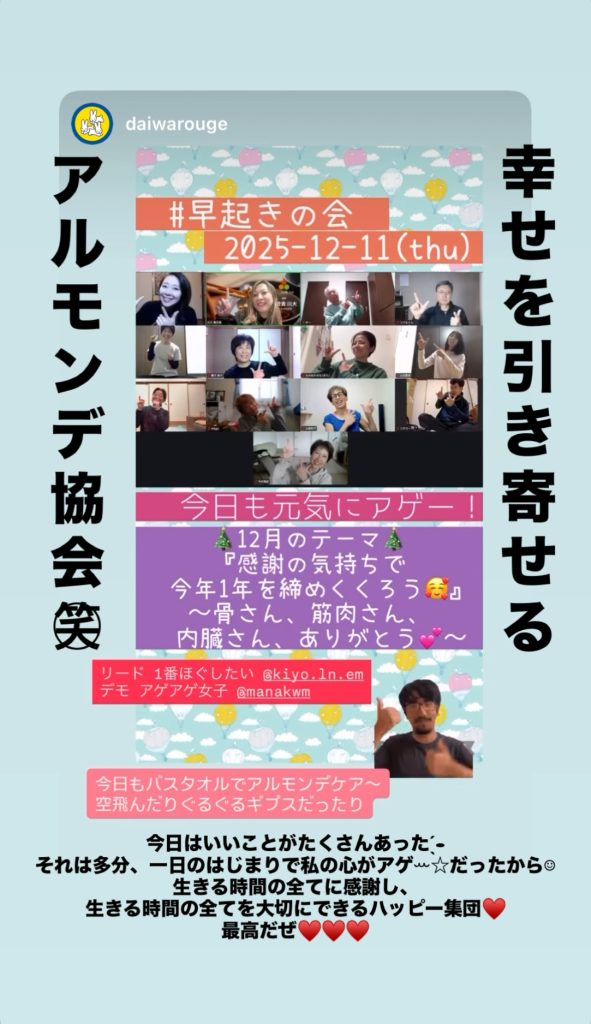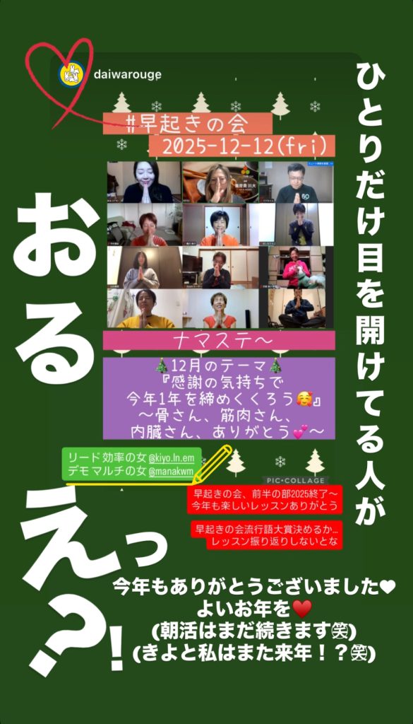 2025.12月10日〜12月21日のあれこれ 2025.12.21 mana SNSストーリーズ 顔は鏡〜イベント開催報告と想い〜 2025年のイベントレッスン終了報告と想い ピックアップ記事 レッスン 無知と無意識から解放されよ 2025.07.03レッスン, 宣伝・告知・お知らせ レッスン みのりこどもえんさんへお邪魔してきました 2025.05.20レッスン レッスン 母業を楽しむために自分を大事にする 2025.05.28レッスン からだバー® からだバー®︎ビューティー モニタリングを通して確信したこと 2022.10.28からだバー®, 宣伝・告知・お知らせ, 想い 関連記事一覧 SNSストーリーズ 2024.6月23日〜28日のあれこれ 2024.06.28 SNSストーリーズ 2024.7月4日〜14日のあれこれ 2024.07.14 SNSストーリーズ 2024.12月1日〜12月12日のあれこれ 2024.12.13 SNSストーリーズ 2024.11月14日〜11月30日のあれこれ 2024.11.30 SNSストーリーズ 2024.8月24日〜31日のあれこれ 2024.09.15 SNSストーリーズ 2025.12月22日〜12月31日のあれこれ 2025.12.31 SNSストーリーズ 2024.11月1日〜11月13日のあれこれ 2024.11.13 SNSストーリーズ 2024.7月25日~8月7日のあれこれ 2024.08.12
