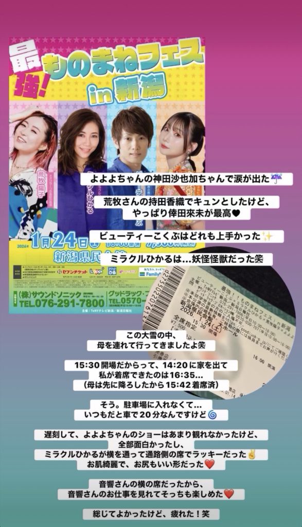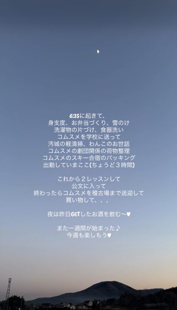 2026.1月19日〜1月31日のあれこれ 2026.01.31 Instagramの プライベートアカウントのストーリーです⭐️ 新潟市体育施設での活動記録や想いの投稿は、 運動指導アカウント こちらでしております😌 mana SNSストーリーズ 2026.1月13日〜1月18日のあれこれ 叔父を想う ピックアップ記事 からだバー® からだバー®︎ビューティー モニタリングを通して確信したこと 2022.10.28からだバー®, 宣伝・告知・お知らせ, 想い レッスン 母業を楽しむために自分を大事にする 2025.05.28レッスン レッスン みのりこどもえんさんへお邪魔してきました 2025.05.20レッスン レッスン 無知と無意識から解放されよ 2025.07.03レッスン, 宣伝・告知・お知らせ 関連記事一覧 SNSストーリーズ 2026.3月1日〜3月15日のあれこれ 2026.04.10 SNSストーリーズ 2025年9月10日〜9月22日のあれこれ 2025.09.22 SNSストーリーズ 2024.6月1日〜7日のあれこれ 2024.06.17 SNSストーリーズ 2026.1月13日〜1月18日のあれこれ 2026.01.19 SNSストーリーズ 2025.6月9日〜6月25日のあれこれ 2025.06.25 SNSストーリーズ 2024.11月14日〜11月30日のあれこれ 2024.11.30 SNSストーリーズ 2025.11月1日〜11月10日のあれこれ 2025.11.12 SNSストーリーズ 2024.7月25日~8月7日のあれこれ 2024.08.12