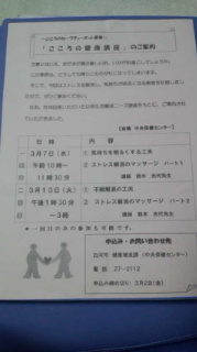 市町村健康講座 こころの健康講座 2012年3月7日 鈴木 光代 今日の午前は白河市中央保健センターで「こころの健康講座」 今日の講座なのに何とも明け方からレジメ作成開始 もう少しだったのに操作あやまって打ったレジメ消えちゃった〜(/_・、) 7時から打ち直してギリギリ間に合い「こころの健康講座」無事終了\(^o^)/ ストレス解消の運動、マッサージ、ツボ… バッチリ伝授しました