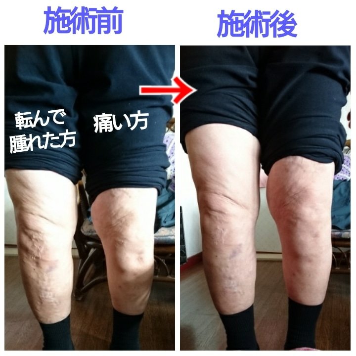 痛いのは(向かって)『右膝下』で膝が曲がらず左は転んでかなり膝下が『浮腫んでボコボコっ』