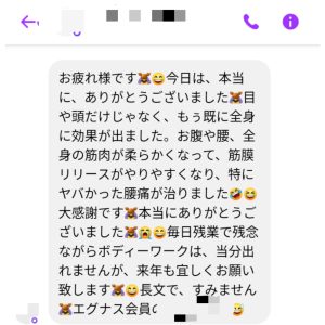 『骨盤矯正(身体のバランスかとれ姿勢が良くなりました)』『背骨一発調整(からだの中心整い安定しました)』『症状別:膝曲がらず(やった方の膝がかなり痛みなく曲がるように)』『側頭骨矯正:視力アップ(アップ内容参照ください!メッセージがありました:本人承諾済)』『全身バランス超整(脚の長さも揃いました)』