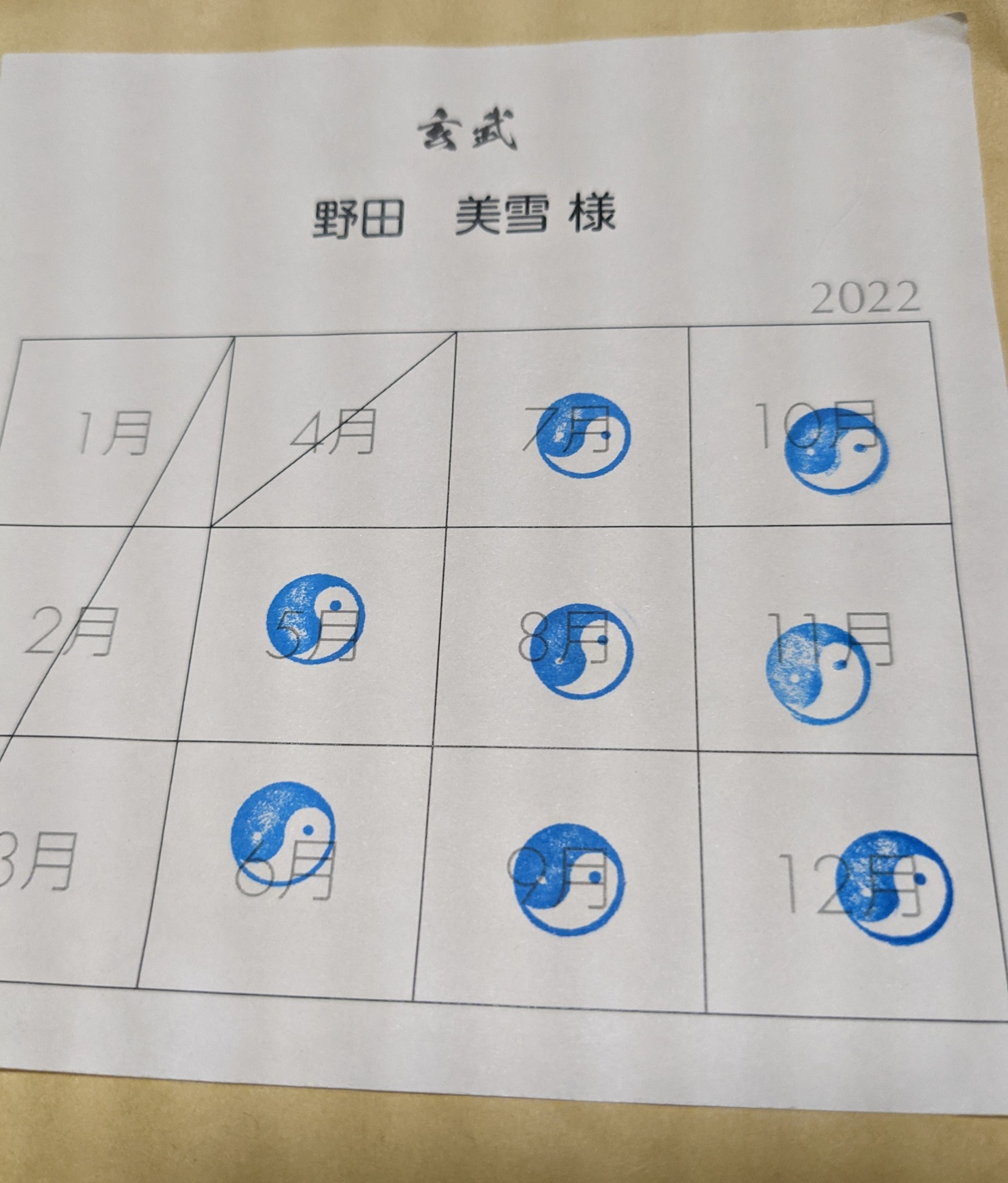 月曜日は太極拳の日。月謝袋に押されたハンコを見て「やっと8ヶ月目かぁ。。」となる。