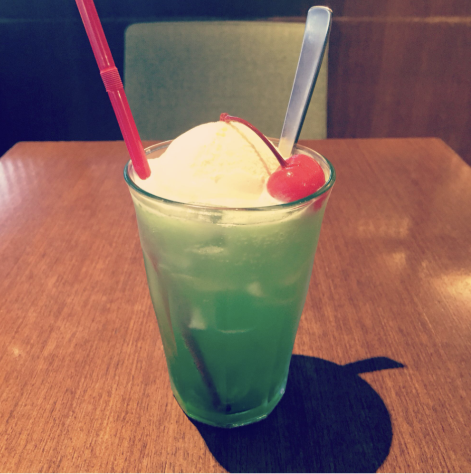 シュワシュワしたソーダ、安っぽいバニラアイスの上に、さらに安っぽいサンランボ🍒 懐かし〜