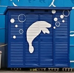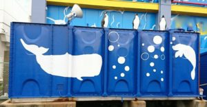 壁の手前に置いてあるコンテナは、さらにブルーウォーターカラーに塗られて、マッコウクジラとジュゴン(尾びれを見るとマナティー?)
