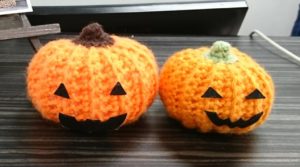 そしてその横に、毛糸で手編みして作ったカボチャ2個🎃🎃