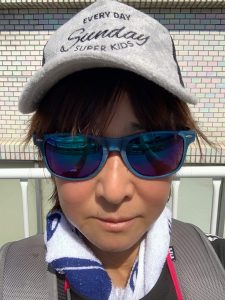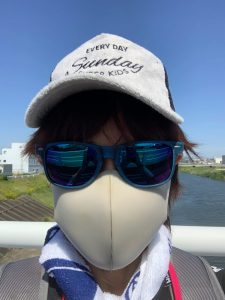 (走っても落ちない、顔にピッタリサイズ。しかもUV99%遮断と、優れものです)