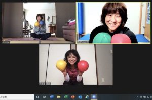 なんと、お1人が転んで腕を痛めてしまって腕が挙げられないとのことでしたので、同じエクササイズを、個々に合わせて変えてお伝えしました。