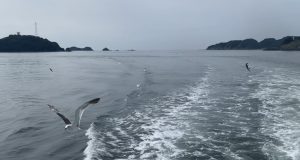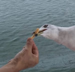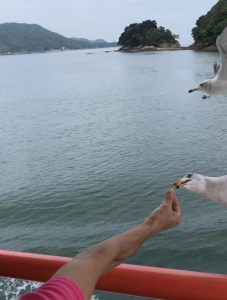 帰りも竜宮城に乗り、カモメにエサを投げてあげて、ナイスキャッチを楽しんで・・