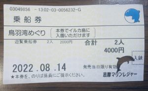 船に乗って、鳥羽湾をめぐり、途中でイルカ島へ寄ってくるコース。