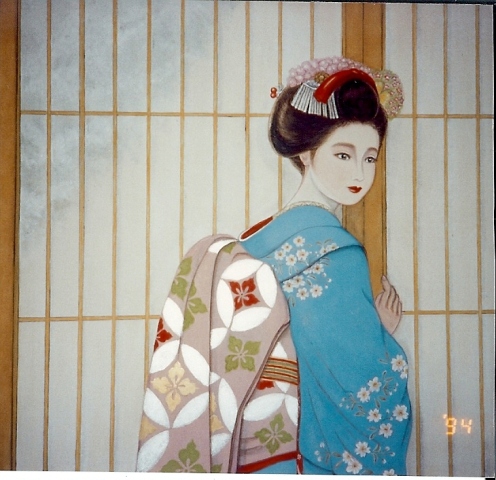描かれているのは、なんとも日本を象徴するような障子戸を開けようと(閉めた?)する舞妓さんの姿ですが、絵画のジャンルでは、洋画なんだそうです