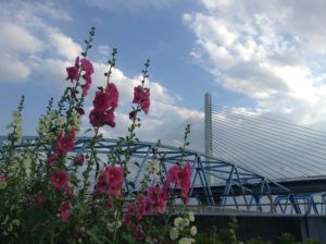 橋の向こうには首都高中央環状線の葛飾ハープ橋が見えます