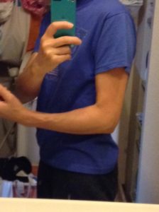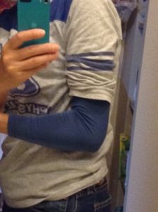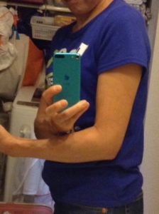 ようやく90°曲がるようになり、がんばればおでこに手を触れることができるようになりました
