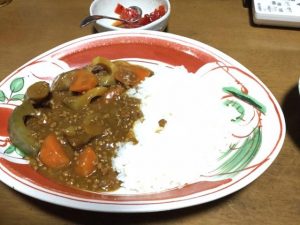 ゴロゴロと形も大きさも適当に切って、一斉に鍋で水から煮て、適当なタイミングでみじん切り玉ねぎと一緒に炒めたひき肉を投入、そこからまた少し煮て、これまた適当なタイミングでいったん火を消し、市販のルーを加えて溶かし、とろみが出るまで煮込むだけ