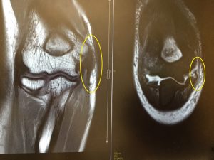 右が3年前、受傷直後のMRI画像で、丸で囲んだ部分の黒いくの字状に見えるのが、切れた内側側副靭帯を含む組織です