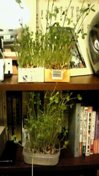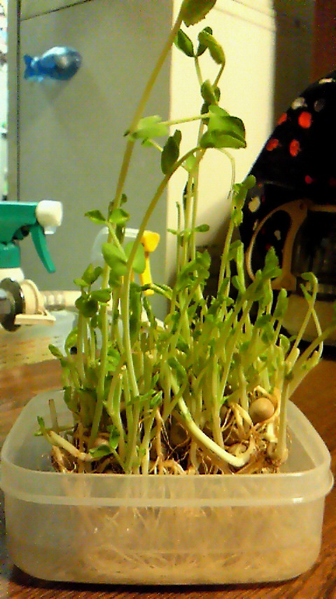 ぱっと見は、カイワレ菜を大きくしたような感じで、エンドウ豆の若菜です