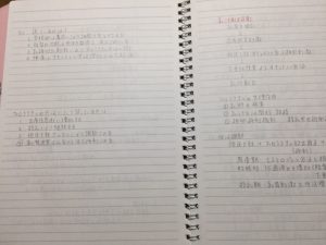 B5のノートを見開きに使い、右半分にはテキストの要点を板書用にまとめ、左側には、国家試験の過去問や問題集の中から、関連の深い問題を書きだし、講義の中で