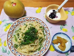 たらこパスタ。メロンの漬物をそえて。