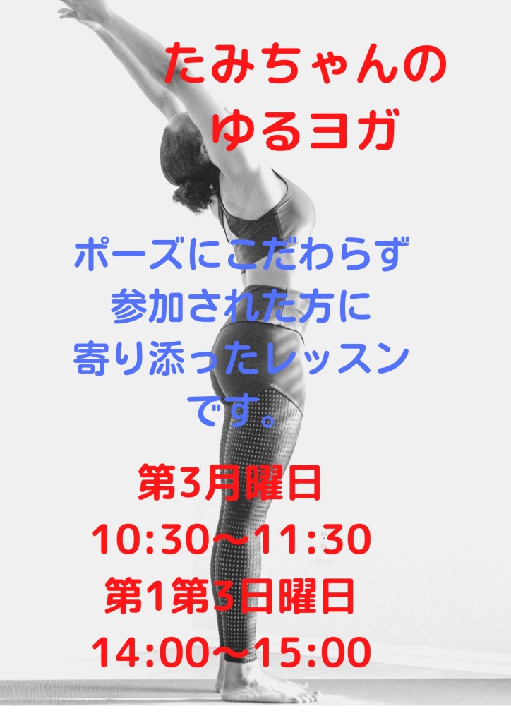 持ち物 ヨガマットまたはバスタオル、ハンドタオル、飲み物