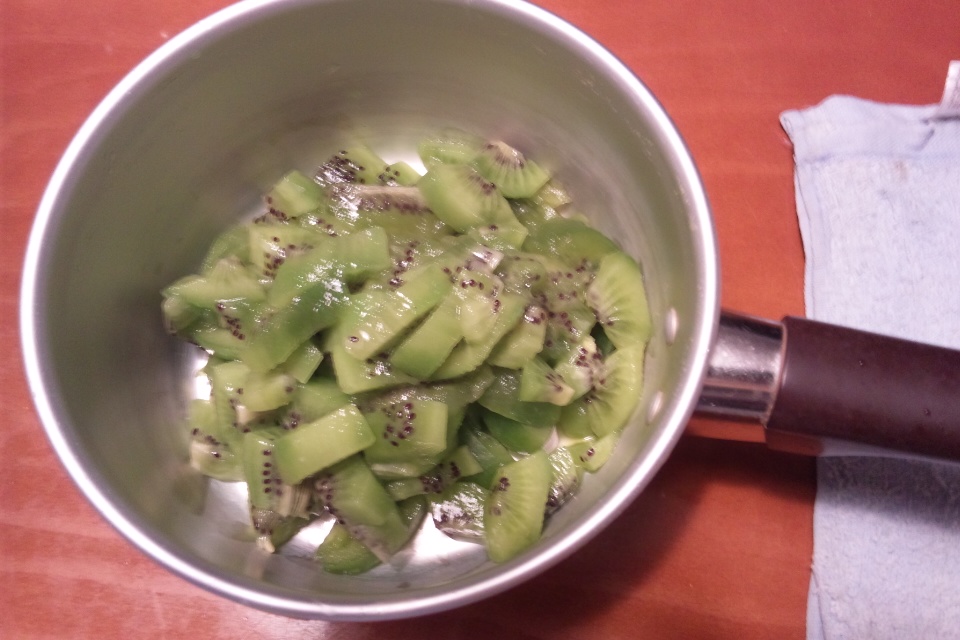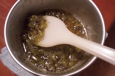 完熟キイウィをいただいたので、一つはすくって食べ残りはジャムに・・・